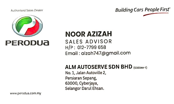 Azizah is a registered and trusted Sales Advisor for Perodua Cyberjaya. My services cover the entire Cyberjaya and all over Malaysia. I offer a variety of car models and the latest promotions. I have over 11 years of experience as a Perodua Sales Advisor and have successfully helped many customers obtain their dream Perodua cars. I also provide free advisory services to my customers.